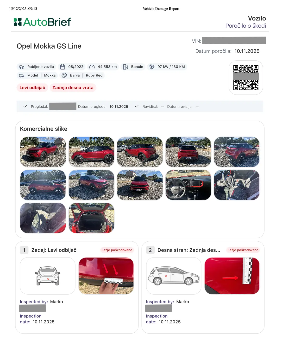 Poročila vsebujejo datum pregleda, fotografije, podatke o vozilu in kategorizacijo poškodb.